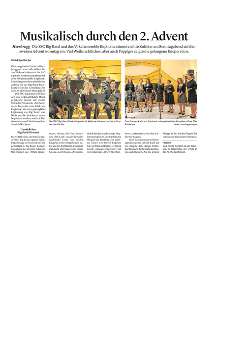 Mario Haltinner, der Bandleader der SSC Big Band, sagte in seiner Begrüssung, er freue sich auf ein gemütliches Big-Band-Konzert am Abend des zweiten Advents. Mit Stücken wie «White Christmas», «Mary, Did You Know» und «Oh Lord» wurde die weihnachtliche Linie von beiden Gruppen weiter eingehalten, zur Freude des Publikums. Franziska Zimmerli überzeugte mit ihrem Solo zu «Let It Snow». Zwischendurch fanden auch einige Neuinterpretationen von Pophits den Weg auf die Titelliste.
