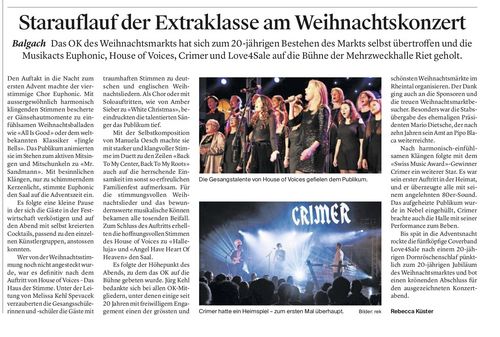 Mit der Selbstkomposition von Manuela Oesch machte sie mit starker und klangvoller Stimme im Duett zu den Zeilen «Back To My Center, Back To My Roots» auch auf die herrschende Einsamkeit im sonst so erfreulichen Familienfest aufmerksam. Für die stimmungsvollen Weihnachtslieder und das bewundernswerte musikalische Können bekamen alle tosenden Beifall. Zum Schluss des Auftritts erhellten die hoffnungsvollen Stimmen des House of Voices zu «Halleluja» und «Angel Have Heart Of Heaven» den Saal.